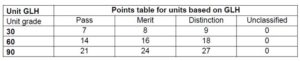 The table below shows the number of points issued for each grade depending on the GLH of the unit.